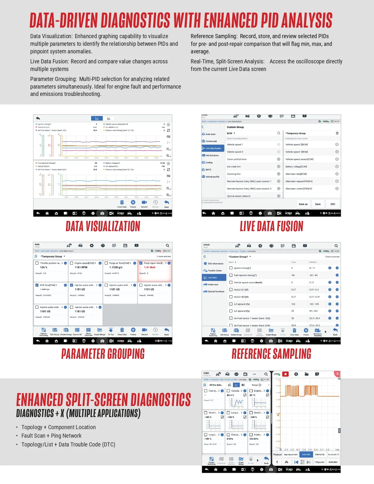 • Enhanced Live Data with custom PID groups, overlays, and pre/post snapshots