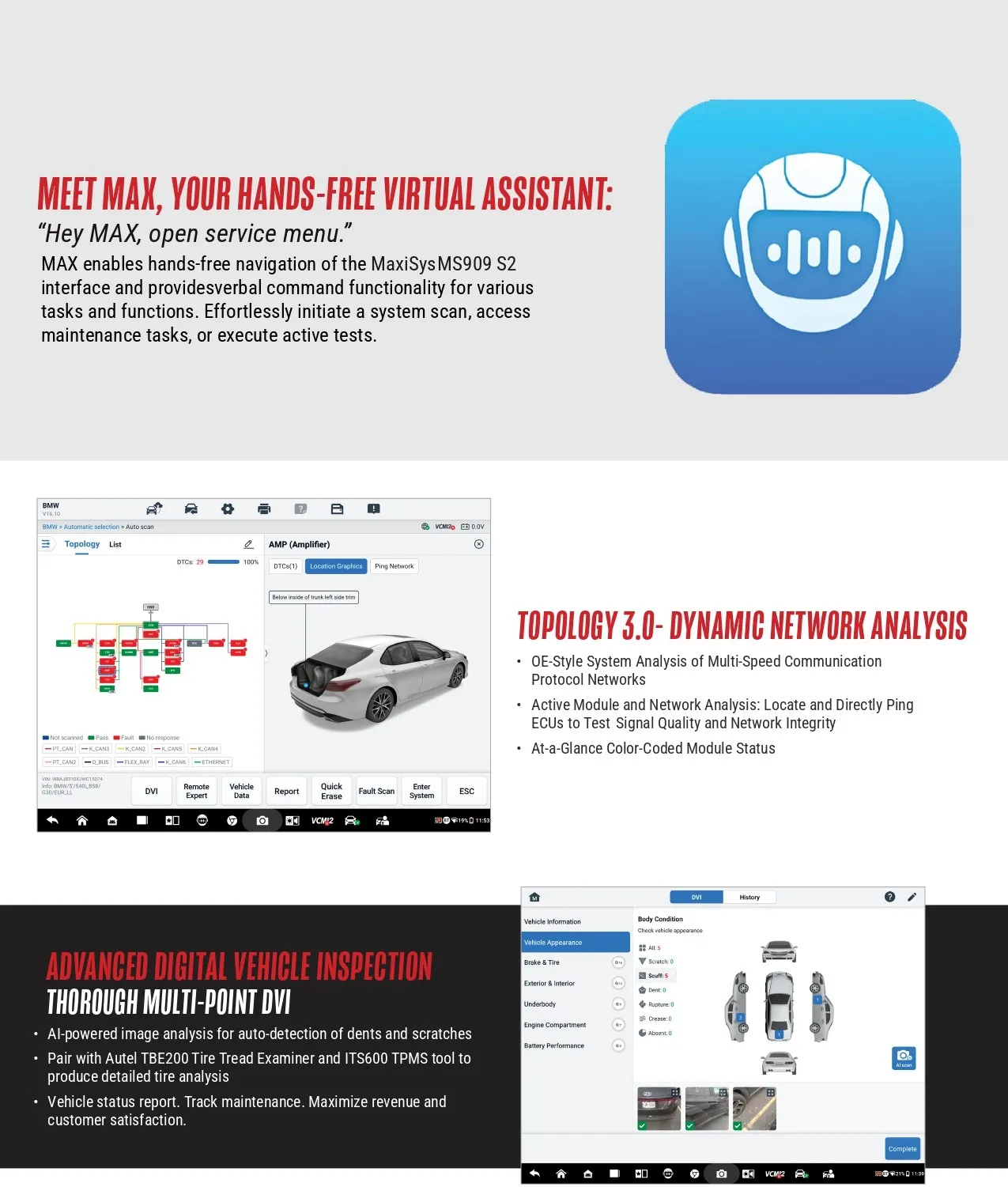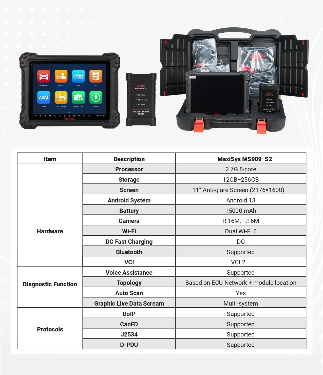 The Autel MaxiSys MS909 S2 is an advanced AI-powered diagnostic scanner built on the proven MaxiSys platform. Designed for professional technicians, it introduces Topology 3.0 with a clear visual layout of vehicle systems, enhanced Live Data analysis for faster troubleshooting, and MaxiSys-grade VCI2 supporting J2534, D-PDU, RP1210, DoIP, and CAN-FD protocols.