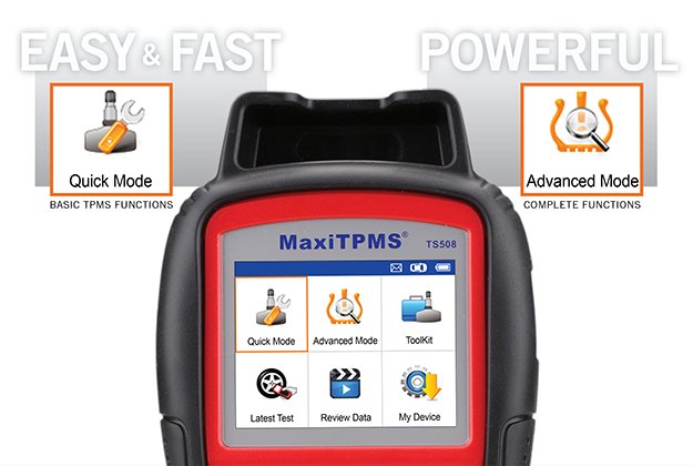 The TS508 is a new generation complete TPMS tool that offers the option to choose one of two service modes from the home screen, to provide faster and smarter TPMS repairs. Based on the TPMS service type needed, the option to choose the basic Quick Mode or the complete Advanced Mode will decrease repair time.