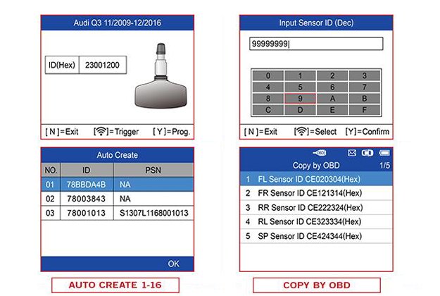 TPMS Advanced Mode: complete TPMS functions to perform sensor check, TPMS diagnose, MX-Sensor program and sensor position relearn.