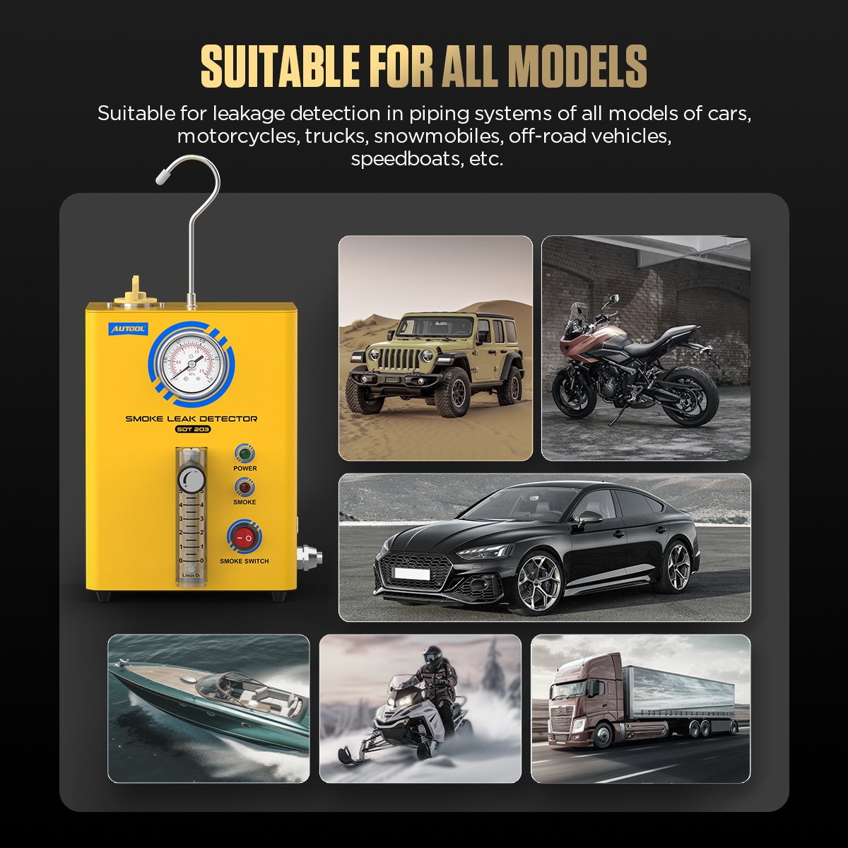 - Wide Range of Applications: The AUTOOL SDT203 Smoke Leak Detector is suitable for detecting leaks in automobiles, motorcycles, snowmobiles, ATVs, ATVs, light trucks, and speed boats, suitable for all models(only for 12v DC).