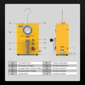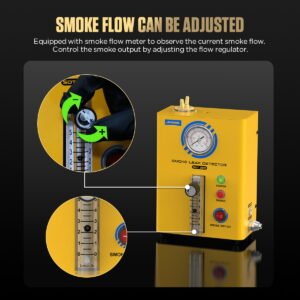 - External Flow Meter: You can easily control the air pressure because the air pressure of each pipe in the car is different. Excessive air pressure damages the pipe, while insufficient air pressure fails to detect leaks. Therefore, the flow meter is very important to protect your detection system more effectively. Make testing safer