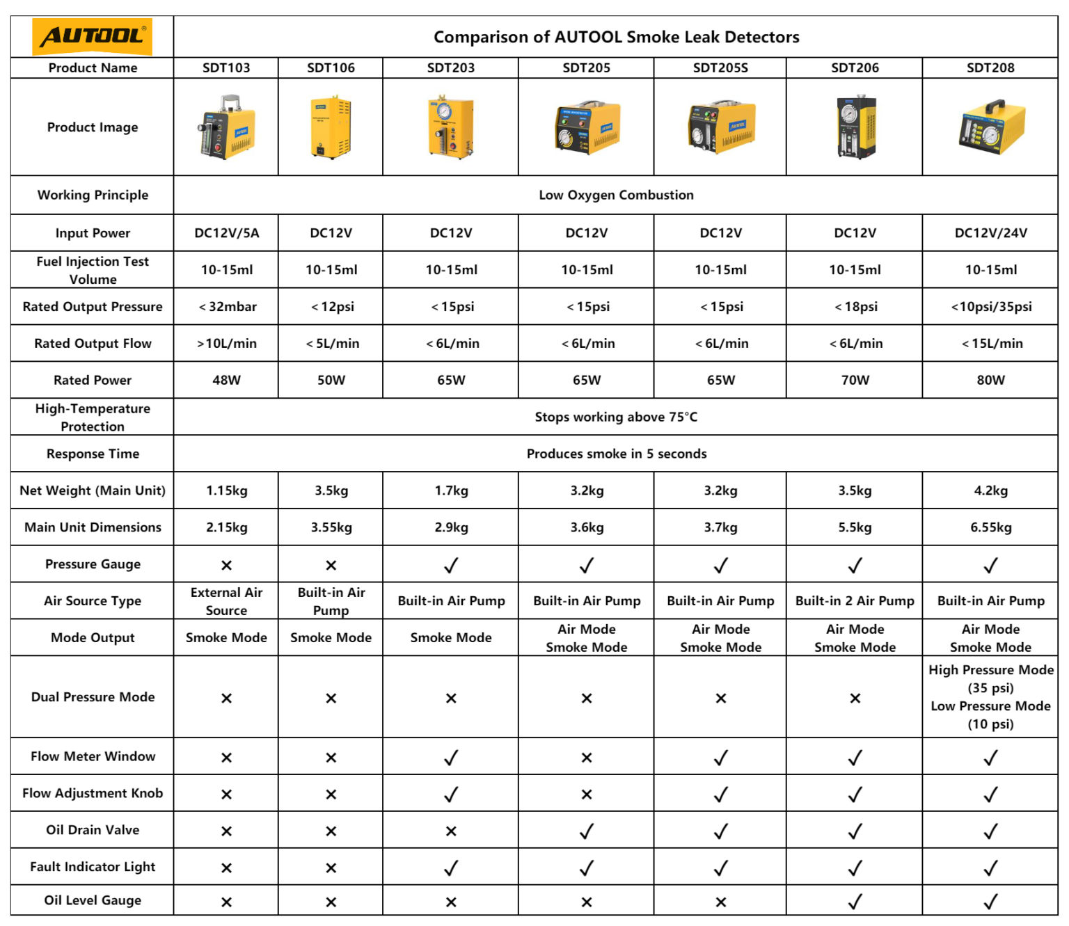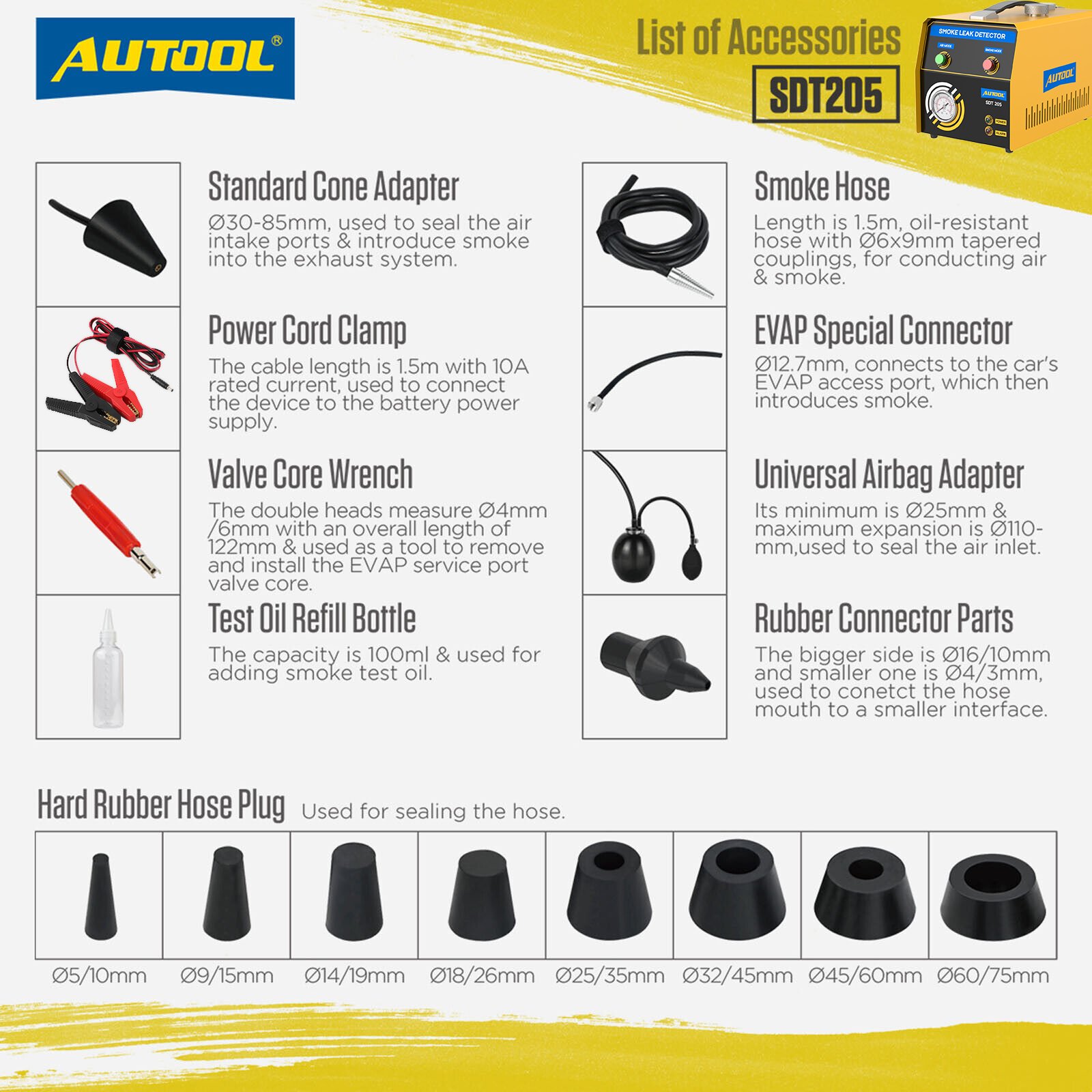 - Wide Range of Applications: The AUTOOL SDT205 Smoke Leak Detector is suitable for detecting leaks in automobiles, motorcycles, snowmobiles, ATVs, ATVs, light trucks, and speed boats, suitable for all models(only for 12v DC).