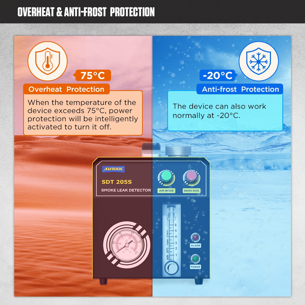 - Overheat and anti-freeze protection: The Autool SDT205S Smoke Detector Machine features the latest intelligent protection devices. When the temperature exceeds 75℃ the protection device will only activate and shut down the power supply to protect the operator and the equipment. Not only is it protected against high temperatures, but it is also suitable for low-temperature operation.