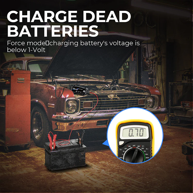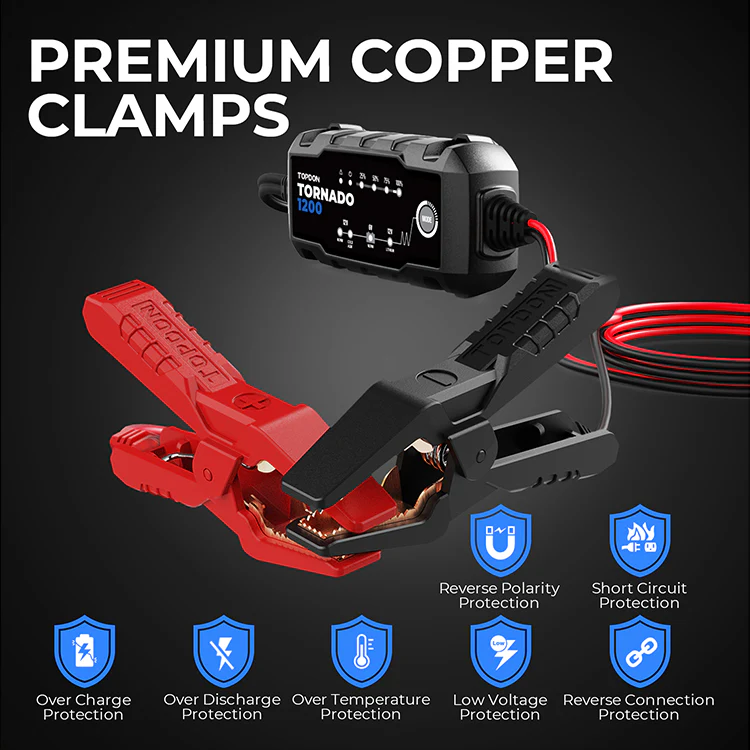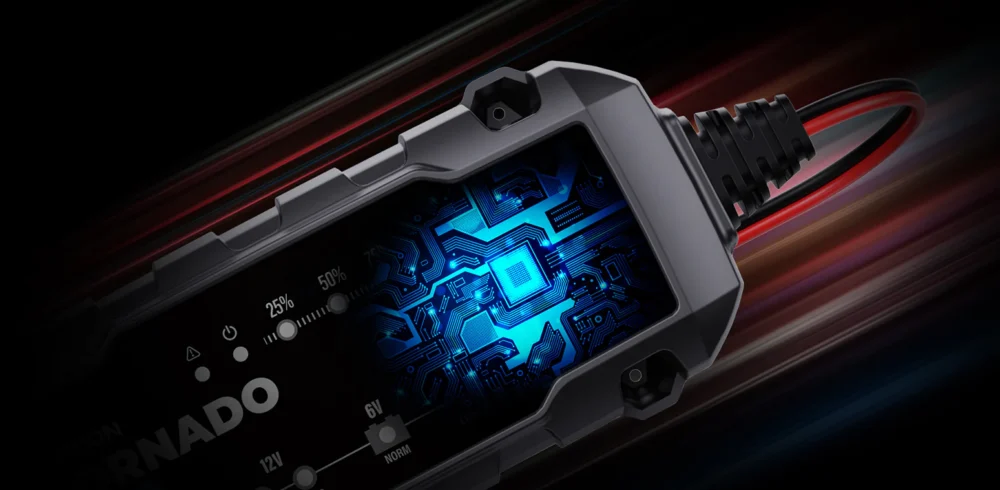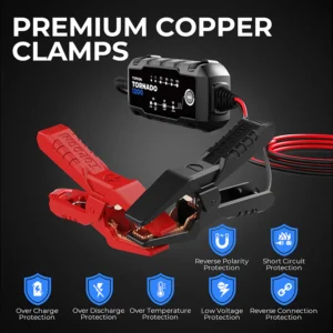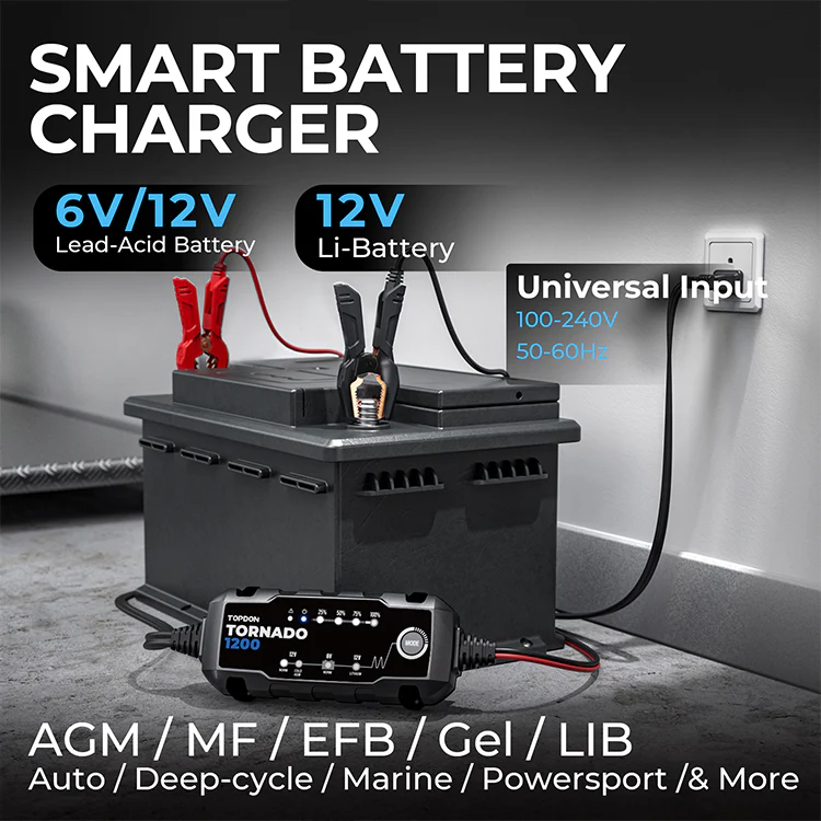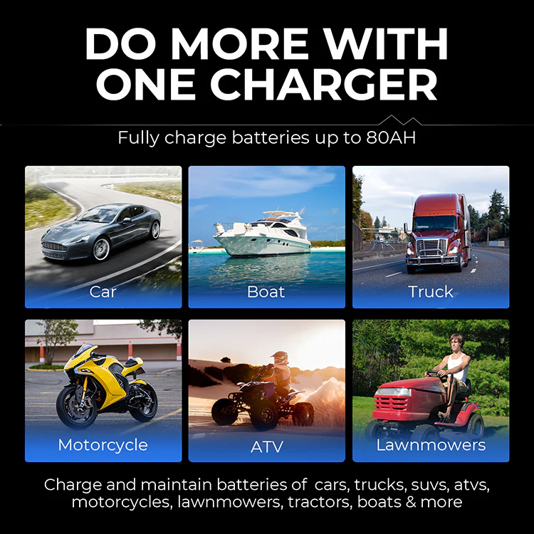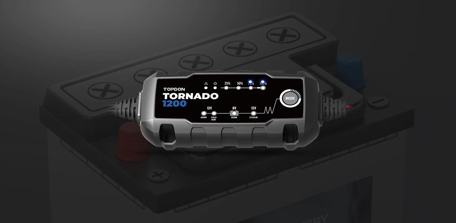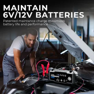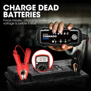 The Tornado1200 is suitable for 6V/12V lead-acid batteries and 12V lithium-ion batteries. Multiple vehicle batteries can be handled by one charger, including cars, motorcycles, trucks, agricultural machinery, dry batteries, and lead-acid batteries.