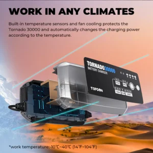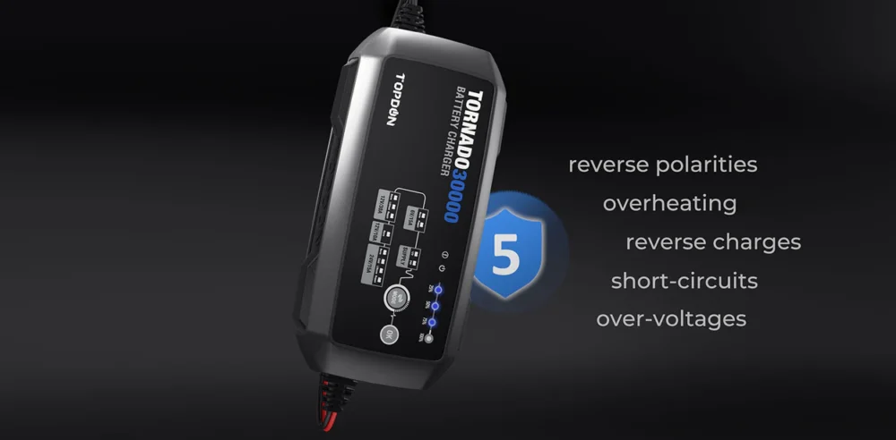 The Tornado30000 protects your batteries against: reverse polarities, reverse charges, short-circuits, overheating, and over-voltages.