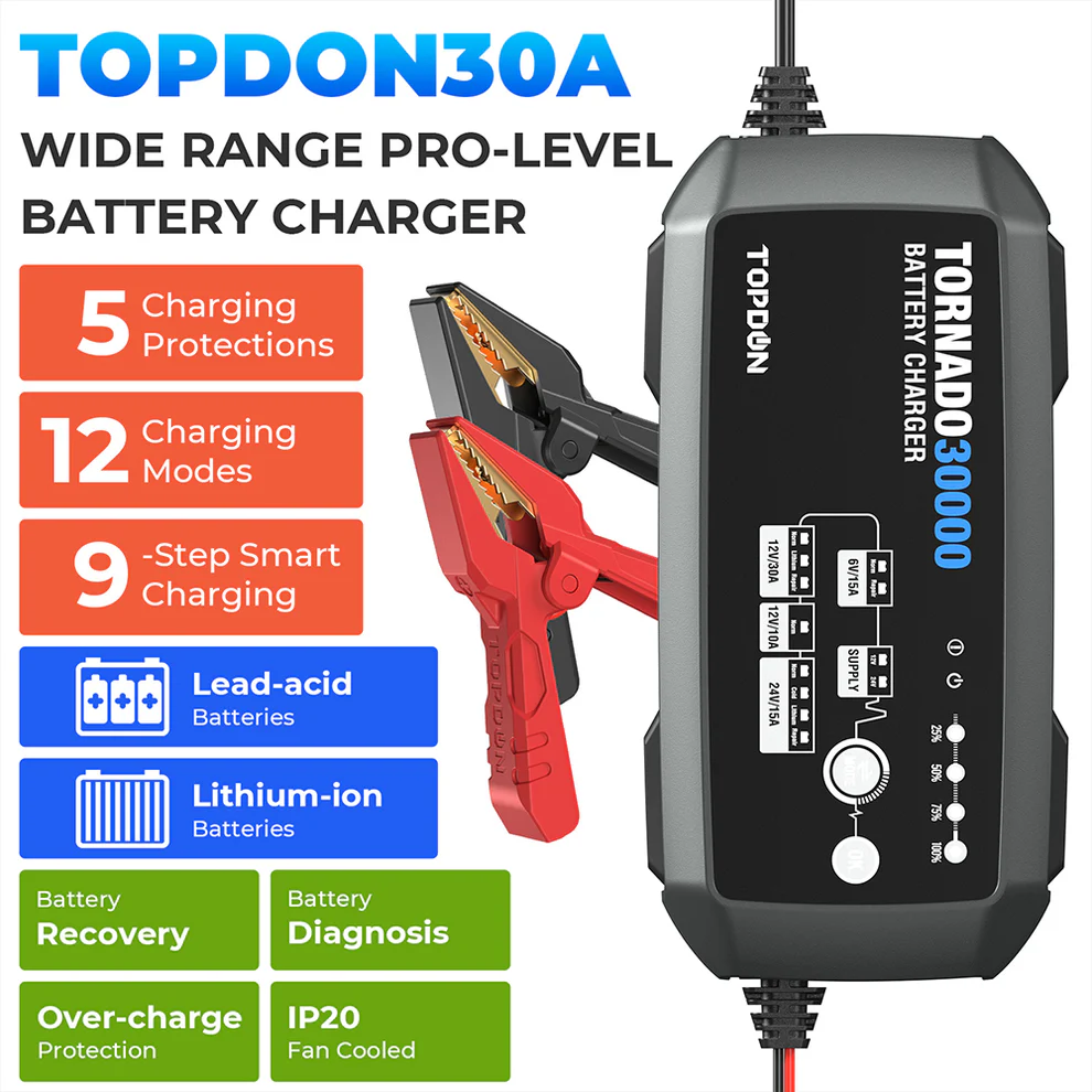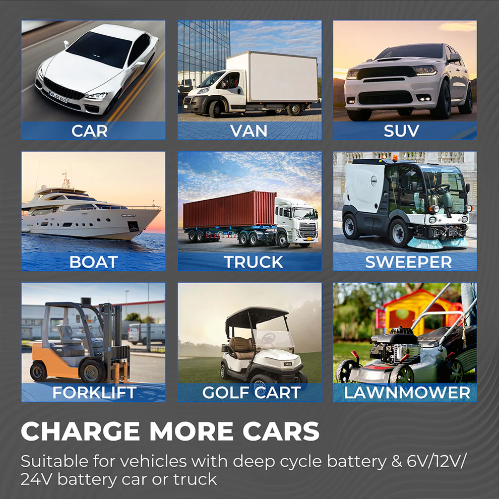 - Supports 6V, 12V, and 24V batteries.