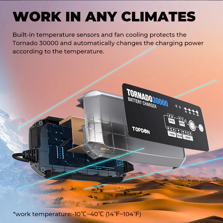 Built-in temperature sensors and fan cooling protects the Tornado30000 and automatically changes the charging power according to the temperature. *Working temperature:-10°C~40°C (14°F~104°F)Â
