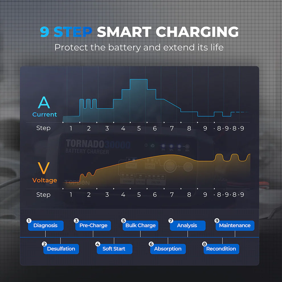 Its 9-step smart charging provides strong protection to the battery and the automatic charging and disconnection system eliminates any risk of overcharging. Use the NORM, COLD and REPAIR modes to automatically match the battery and extend its life.