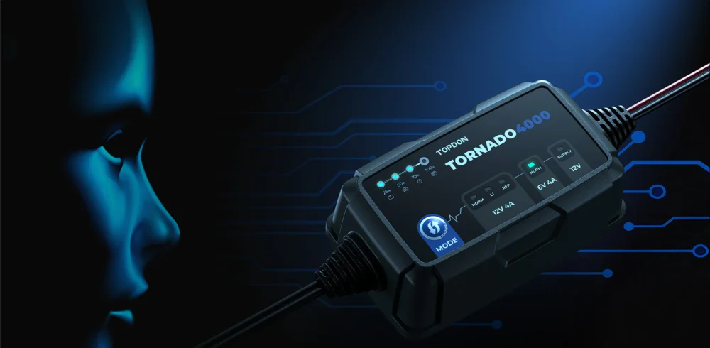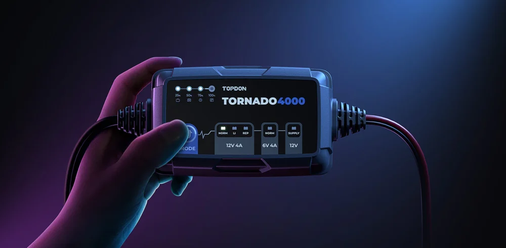 Tordado4000 offers 5 charging modes: 12V NORM, 12V LI, 12V REP, 12V SUP and 6V NORM. Simply choose the most suitable charging mode according to your battery and let the Tornado4000 go to work.